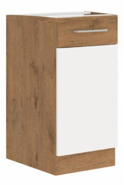 Alsó szekrény VEGA D40 1F BB Anyag: laminált DTD Szín: fehér extra magasfényű HG/tölgy lancelot Méretek (SzéxMéxMa): 40x52x82 cm Szekrény munkalap nélkül Csillapított záró rendszer Beleértve az alsó lécet Szétszerelt állapotban szállítva Lehetőség munkalap vásárlására, tölgy lancelot kivitelben. Az alsó szekrényekhez rendelhető lancelot tölgyfa munkalap: 27 900 Ft/m. Vásárolható hozzá univerzális (B/J) mosogató LAY ON.