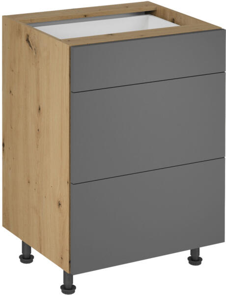 Anyag: laminált DTD Szín: artisan tölgy/szürke matt Méretei (SzéxMéxMa): 60x47x82 cm Ajtók anyagvastagsága (artisan tölgy): 1,5 cm MDF (szürke) vastagsága: 1,8 cm Az PUSH OPEN rendszerben 3 fiók Munkalap nélkül szállítva Alsó léc nélkül szállítva A belső oldal színe: fehér Bontásban szállítva. Az artisan tölgy munkalap ára 30 900 Ft vastagsága 38 mm, a fekete vulkán munkalap ára 35 500 Ft/ vastagsága 38 mm. Az alsó léc ára 4 900 Ft/1 m vagy 9 800 Ft/ 2 m. A 47 cm vagy 58 cm mélységű lábazatzáró elem ára 2 500 Ft. Minden alsó szekrényhez kell rendelni az alsó léchez tartólábat 500 Ft/2 db. A D60S3 és D40S3 szekrényekhez fogantyúval vagy Push Open rendszerrel ellátott szekrényt kell választani.