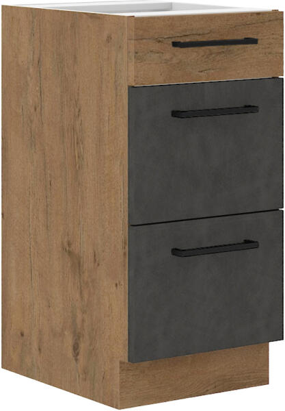 Alsószekrény VEGA 40 D 3S BB Anyag: laminált DTD Szín: matt szürke/tölgy lancelot Méretek (SzéxMéxMa): 40x52x82 cm Szekrény munkalap nélkül Csendes ajtócsukódási rendszer Alsóléccel Szállítás szétszerelve Lehetőség munkalap vásárlására, tölgy lancelot kivitelben. Az alsó szekrényekhez rendelhető lancelot tölgyfa munkalap: 27 900 Ft/m. Vásárolható hozzá univerzális (B/J) mosogató LAY ON.